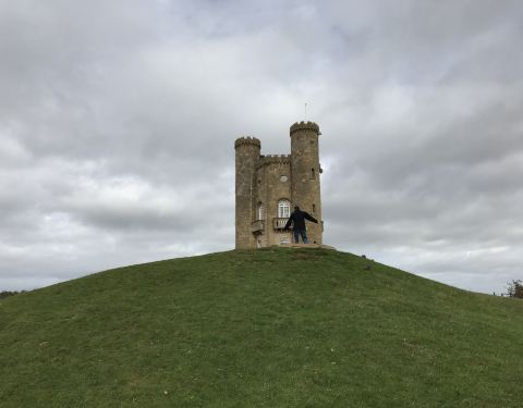 塔周围被圈起来的地方养有很多小鹿。塔上有很多圆形的瞭望口,前面都摆放有椅子,可以坐着看外面。外面太冷,还是躲在塔里比较好。最上层是露台,站了会儿拍几张照片赶紧缩回室内。一大片小黑羊告诉游客多远可以看到什么的提示牌,然鹅天气不好,我已经看得很努力了摆放的塔模型抓拍了一张放飞自我的多先生(说了是抓拍就不要怪我没拍全塔顶喽)没有蓝天,略有遗憾,不过阴云密布或许更英国吧。抓帽子真的不是凹造型,是风真的太大了,一松手帽子就被吹跑。当天预报的气温并没有低到夸张,但是百老汇塔底下风超级超级大,我心想这估计就是传说中苏格兰高地的妖风啊,更加坚定了要带更多更厚更保暖衣服去高地的决心,于是带且只带了那些,赶上了高地这两年最热的两天,捂得厚厚的我每天一身汗,经验主义害死人呀。