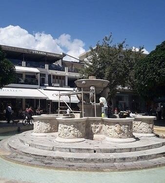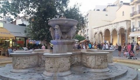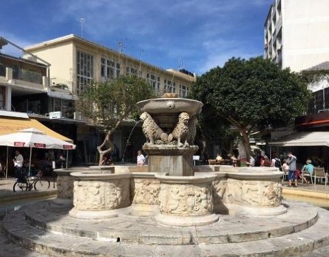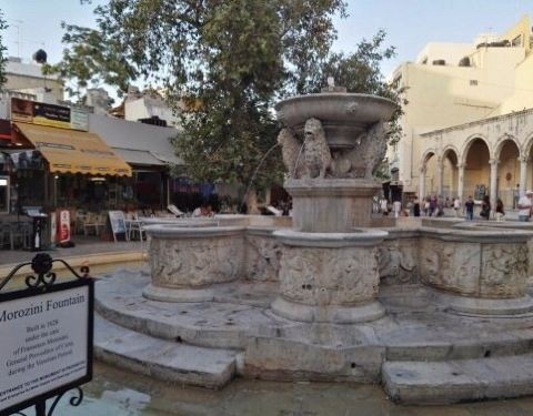 喷泉座落于伊拉克利翁的雄狮广场,在1628年由当时总督莫西尼都监,所以又叫莫西尼喷泉,喷泉上雕刻三只威猛雄狮狮头,它们口中喷泉落入下面精美的水槽中,准确率极高,这座喷泉距今已达387年的历史了,历史的沧桑没有磨练它本神的优美,我是早上去照相的,人比较少,喷泉旁边是教堂和一些店铺,在喷泉旁边很多酒吧,可以边喝饮料边欣赏。
