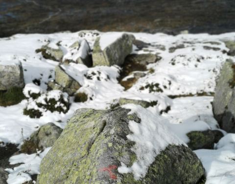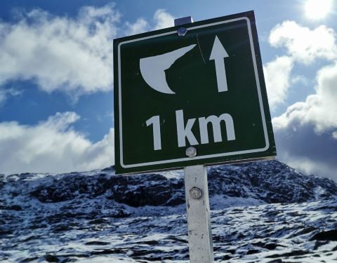 挪威有名的三块石头之一,据说攀爬难度最高,往返28公里。 停车场2号是28公里,自助停车交费,景点是不收费的。 3号停车场应该能节省盘山路4公里,但是需要提前预约停车。 一路有红T图标指路,外国人经常玩户外 可能时间会快一些,山顶已经是雪路,我不停歇攀爬了10个小时。