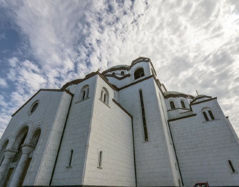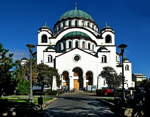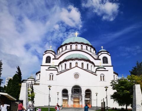 圣萨瓦教堂坐落于贝尔格莱德老城区东部的一座丘陵上,建造始于1935年,出于种种原因,整个外部建造工程2003年12月才告结束,而内部装修至今仍在进行。教堂的周围是一处南北向的公园,园内花木错落有序,并有一组夹道式喷泉。平时人们三五成群、散步小憩,节假日时更是熙来攘往、络绎不绝。草地、空场、喷泉成了家庭的聚会地和孩子们的游乐场。