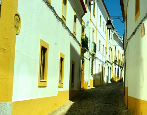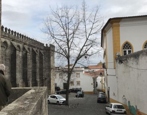 埃武拉古城参观完人骨教堂,沿着街道上一个缓坡,前面显露出一个典型的罗马建筑,这是用来祭拜月亮女神狄安娜的罗马神庙遗址,神庙只剩下基台和三面罗马柱,这也是目前葡萄牙唯一遗留的古罗马神庙,罗马柱由黑色的石头雕刻后垒成,历经1000多年,柱子表面已经成了磨砂样,下面的台基石也失去了棱角,一幅饱经风霜的模样,旁边是圣约翰教堂,一个小小的花园,从这里的平台向下看,可以看到埃武拉部分城区建筑,白色的墙壁,橘黄色的房顶,高低错落,走入小巷,两旁不乏古宅旧屋,具中世纪风格。