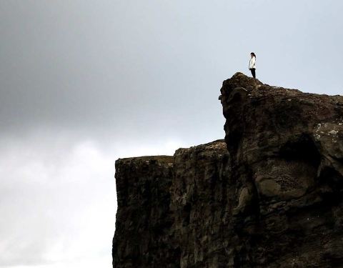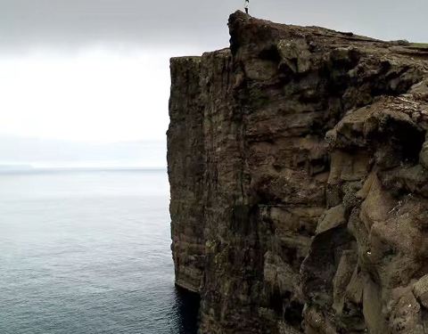 Sorvagsvatn的往返徒步,限于水量和角度(需要无人机拍摄),湖面与海面相连于瀑布的场景并不突出。险峰顶端的小黑点,是妞总。