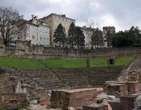 的里雅斯特是意大利东北部边境港口城市、工商业中心,弗留利-威尼斯朱利亚区和的里雅斯特省首府,罗马剧院建成于公元1世纪和2世纪之间,典型的半圆形古罗马剧场形制。位于统一广场东南侧,夏天时偶尔还会举办音乐会。