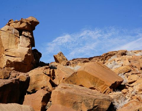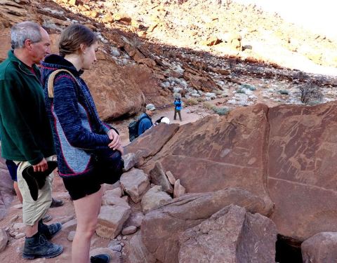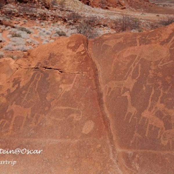 只有当你进入到这地方才能理解这岩画的魅力,很荒凉的一个地方,必须要开车前往,是纳米比亚西北荒漠中一座峡谷里被风化的岩石群,上面有著名的岩画,被列入世界文化遗产。岩石林立在四周,红色,徒步而入,可以看到在岩石上的早年的画,羚羊、长颈鹿、犀牛等,还能从这些画中看出辛巴人的发展。