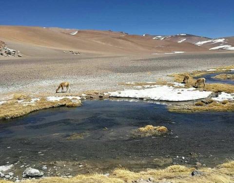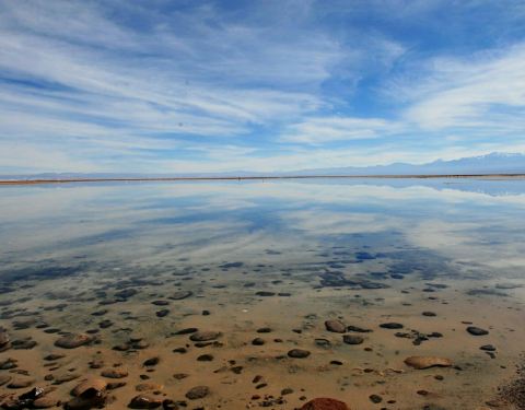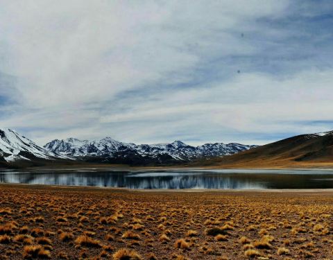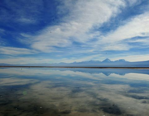 阿塔卡马的安第斯高原湖泊是一片面积,水域非常大的高山淡水湖泊。这里的湖水主要由周围的高山融雪汇聚而成,湖面十分的平静,感觉就像一面巨大的镜子,将周围的雪山和蓝天白云倒映其中,非常的漂亮。