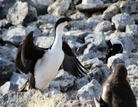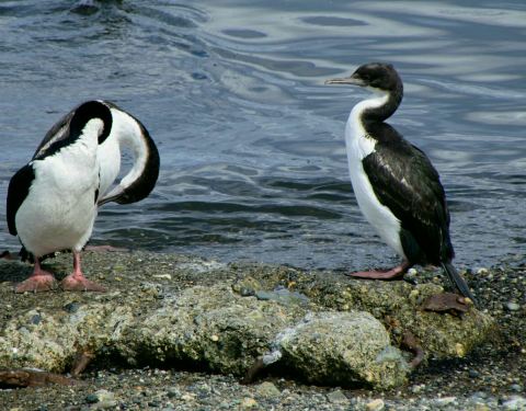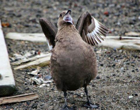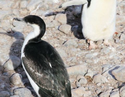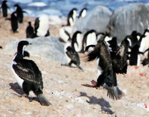 海鸟 企鹅捕食鱼虾,又被海豹海狮海狗捕食,海豹堂兄弟们又是鲸的食物,海鸟除俯冲潜水捕鱼外,其它动物捕食时也是它们获取残羹剩饭的好机会。这就是南极动物的食物链。 海鸟中以贼鸥和鸬鹚较为常见。
