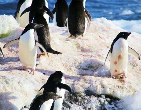 外出捕食的成年企鹅聚集在岸边,寻找安全的下水地点和等待合适的下水时机