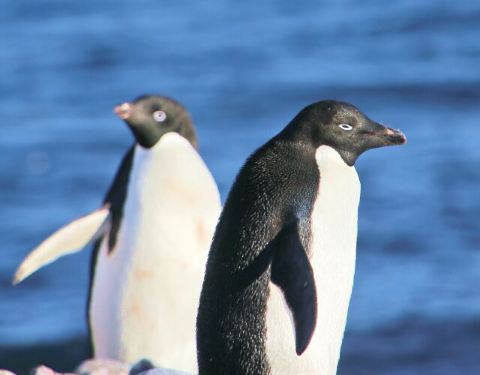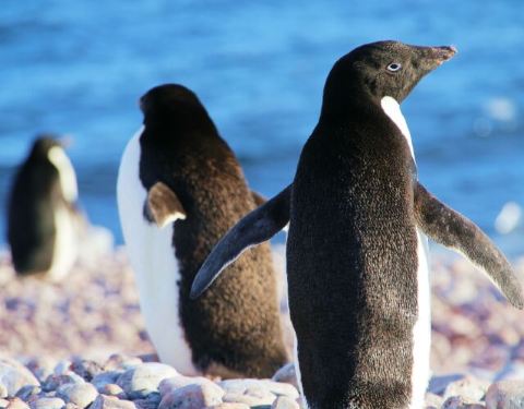企鹅陆地上少有天敌,所以岸上的企鹅很安详,一点都不怕人,估计把人当作是另一种大个子的企鹅吧。 它们成群结队在岸边摇摇摆摆地走来走去,寻找着安全的地点下海。