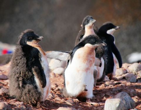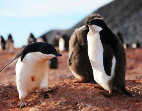 登上企鹅岛看企鹅_03企鹅的家一般安在离海岸有一定距离的山坡上,可防止海豹海狗们的偷袭。岸边步行的企鹅则是外出捕食的成年企鹅。这个季节,正是阿德利企鹅的雏鸟孵化出来不久,正在褪去浑身灰色的绒毛。它的父...