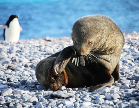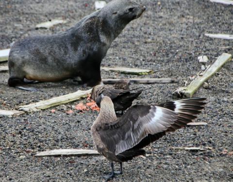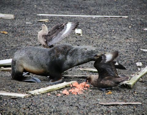 狗嘴夺食 南极鸟类的天敌只有气候,夏天吃胖了才能走足够的体力长途迁徙过冬哦。 成年海狗外出猎食,回来再喂食小海狗。小海狗用餐时遭到了一群鸟的抢夺,这鸟就是赫赫有名的贼鸥。小海豹奋力护食,咬向抢劫犯,无奈对方更灵活,只好放弃,悻悻而去,坐在一旁眼睁睁看着自己的食物被瓜分一空。强盗则得意地仰天长啸。