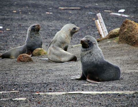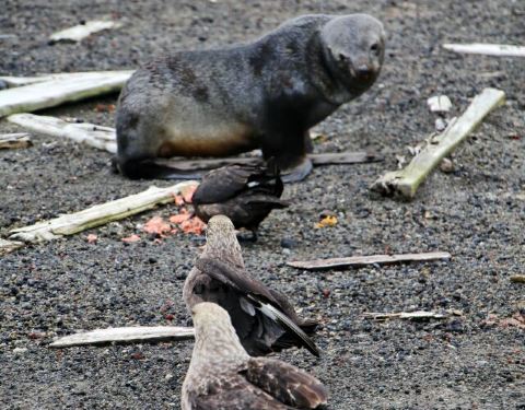 小海狗用餐时遭到了一群鸟的抢夺,这鸟就是赫赫有名的贼鸥。 成年海狗外出猎食,回来再喂食小海狗