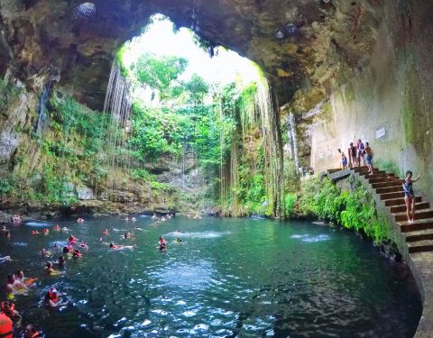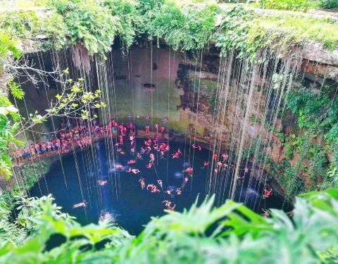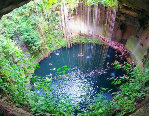 这是坎昆名气最大的一处火山天坑了,在低于地表几十米处有一个大约半个足球场大的天坑,形成了一个天然的游泳池,水非常的清凉。大家可以在这里潜水和跳水,非常的刺激。