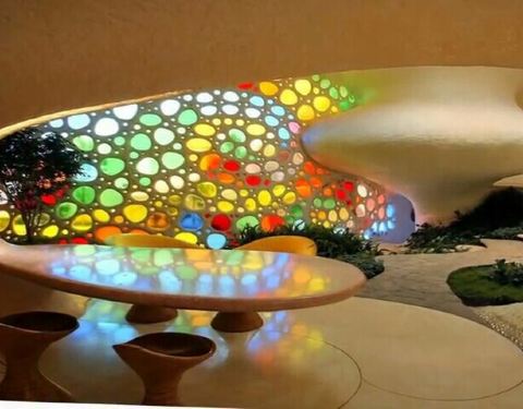一座位于市区的仿生建筑,有一面巨大的镶嵌着彩色玻璃的墙,使得阳光渗透之后产生五彩缤纷的效果