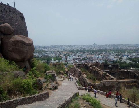 我是当地时间下午五点半过去的,正好是最后可以允许进入的时间前。进去后,就可以顺便逛了,但一定在天黑前出来! 门票外国人是200印度卢比,如果请导游大概500卢比。 基本上是两条路线可以选择,一条内环,一条外环。最后终点是通过爬山到达山顶,然后从海拔150米高的山上走1000多个台阶下来! 山顶可以俯瞰整个海德拉巴,还有国王王后当年使用的游泳池的旧址! 非常不错的地方,值得推荐。全程2小时左右!
