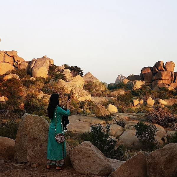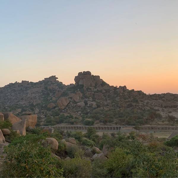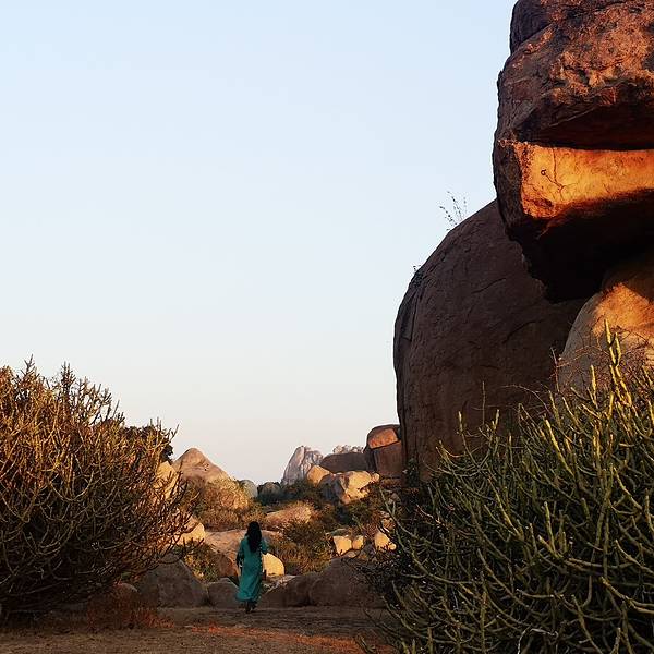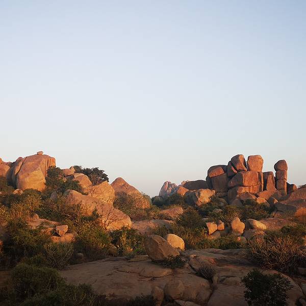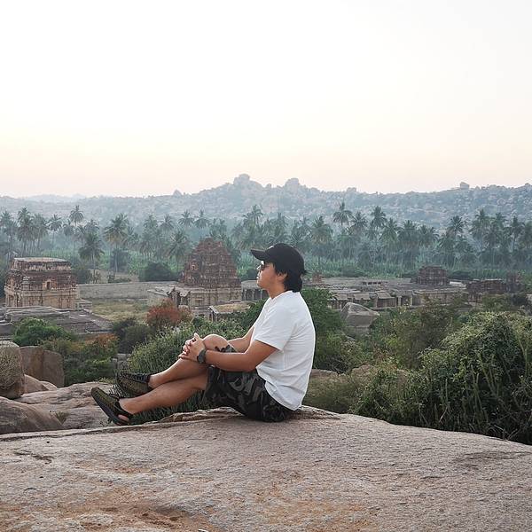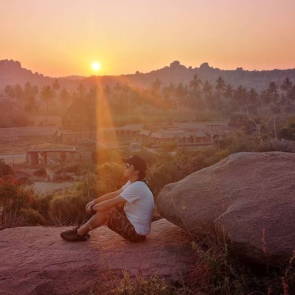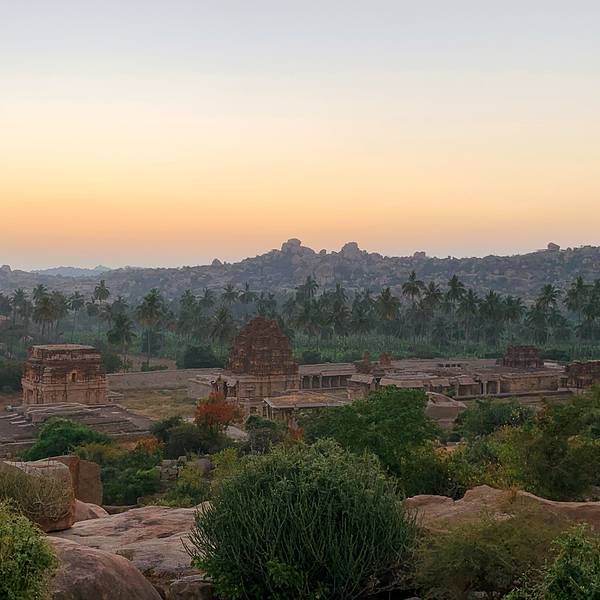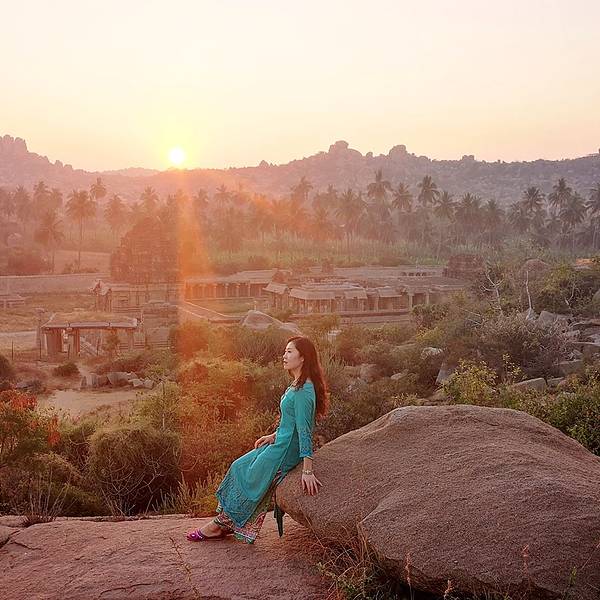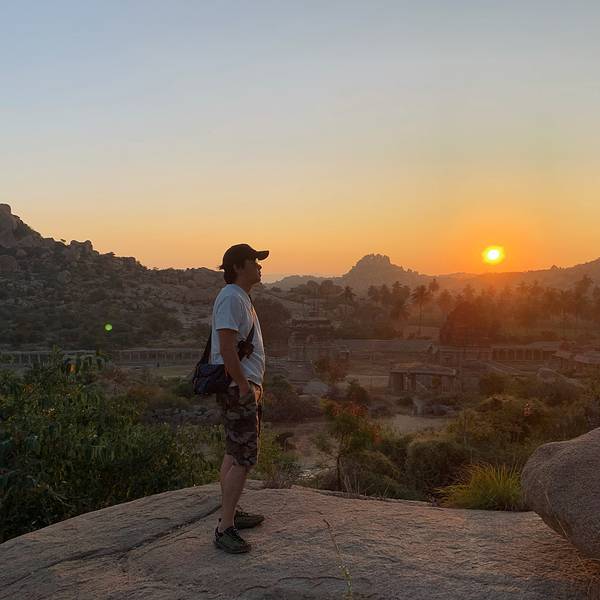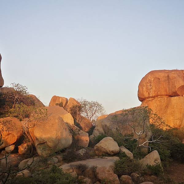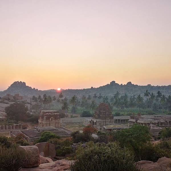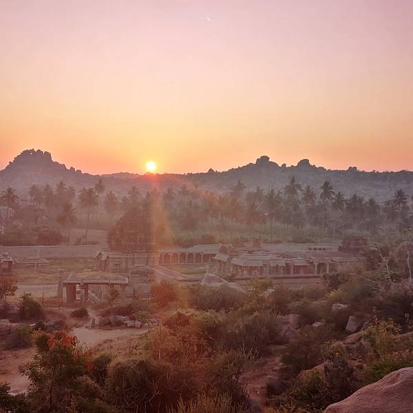 亨比的日出在六点半左右,昨天的奔波硬是让两个人睡过去了。睁开眼就往东面地势高的地方跑去。才爬上一个小山坡,感觉太阳就快要出来了。完全被眼前的景色惊艳到。晨雾还未散去,四周是整片整片光秃秃的石头山,并不高,仅有一些类似仙人掌这种耐旱的植物,很多大块岩石彼此堆在一起,很荒凉的感觉。远处茂密的丛林中一座规模宏大的寺庙,配上昏黄泛红的天空,荒凉而神秘。看了看地图,原来那是阿楚塔拉亚神庙(Achyutraya Temple),旁边就有通往亨比最高的马堂山的小路。一轮红日缓缓升起,温暖的阳光让这层薄雾宛如金红色的柔纱笼罩大地,寺庙遗迹,山石林木,万物都有了色彩。朝阳照耀下的景色,直接把人拉到了那个久远的时代,让人感觉穿越了时空。当太阳腾空而起,光芒万丈的时候,那些数不清的石头又批上了金色的外衣,特别好看。回首来时的路,刚才还黑漆漆的,现在却是一片气派的广场,原来亨比市集就在我们脚下。它是古时候的商贸中心,一排石头建筑和整齐的椰子树一直延伸到高耸的和维鲁巴克沙寺庙(Virupaksha Temple)。