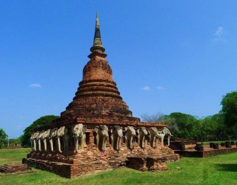 位置在素可泰老城的东边,需要骑自行车去。没有门票,也没有人看着,随便进去。看起来比较壮观,佛塔下方是一圈大象雕塑。据说是以前的一个大臣修建的。