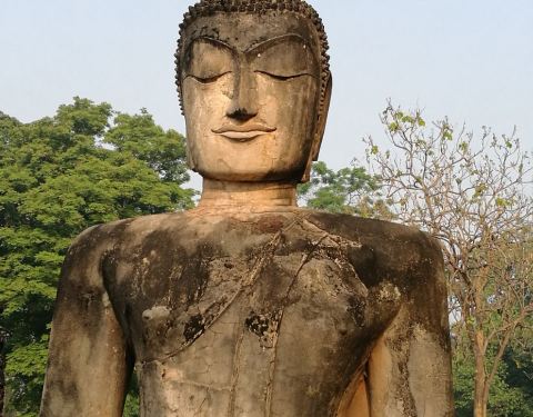玉佛寺曾收藏过泰国最神圣的玉佛,就是现在曼谷大皇宫玉佛寺里的那个,因此这里也叫玉佛寺。如今这儿的标志就是一尊卧佛和两尊坐佛,导游册的封面就是这三尊佛像,介绍说佛像面部线条比较尖锐,看了看确实如此,...