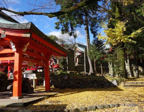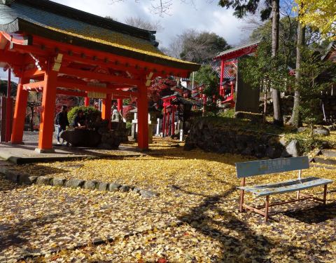 秋天风景如画,满地金黄的银杏树叶三光稻荷神社位于犬山市犬山城下,和针钢神社相邻,神社有名的是那一排排的鸟居,通体红色,穿过鸟居,也可以到达犬山城。秋天风景如画,满地金黄的银杏树叶。