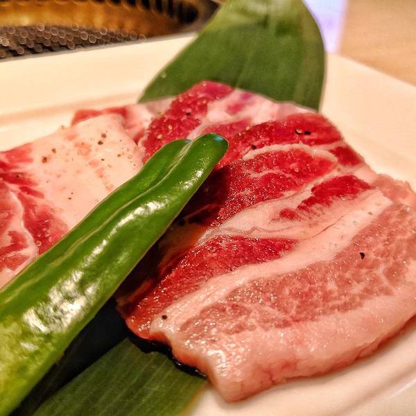 和牛的肉质细嫩,油脂分布很均匀。炭火烤至五、六成熟,半红肉入口时肉滑溜醇香,肉汁丰富。还有黑猪肉也不比和牛逊色,甚至更胜一筹。