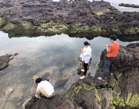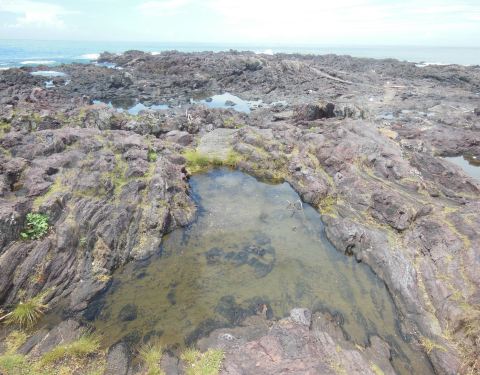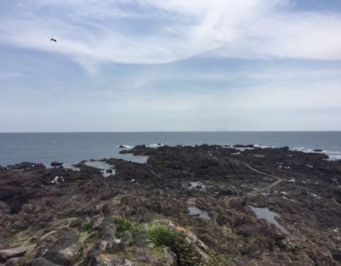 从这里可以看到绵延的海岸线,还有海岸线尽头的樱岛。不过既然是在海边,应该是祭海神的吧一直奇怪,为什么明明在日本九州鹿儿岛最南端的长崎鼻,明明不在长崎县。 长崎鼻景区现在是一个公园,进入园内,先看到的是一个红色的龙宫神社,浮想联翩的我想到,一,这是祭海神的?二,是求雨的?不过既然是在...一直奇怪,为什么明明在日本九州鹿儿岛最南端的长崎鼻,明明不在长崎县。 长崎鼻景区现在是一个公园,进入园内,先看到的是一个红色的龙宫神社,浮想联翩的我想到,一,这是祭海神的?二,是求雨的?不过既然是在海边,应该是祭海神的吧。 沿途有很多售卖土特产的小店,鹿儿岛特色的黑猪肉,紫薯产品有很多种,竟然看到海龟,看售价并不便宜,强烈怀疑是标本。 沿着步道向前,开到长崎鼻的灯塔下,据说这个灯塔的坐标就是九州的最南端了。从这里可以看到绵延的海岸线,还有海岸线尽头的樱岛。 灯塔下的山脚边,海边的山体都是熔岩,海水冲击后在岩石上留下一个个形状不一的小水坑,还能看到一些海洋小生物在里面游弋。 展开
