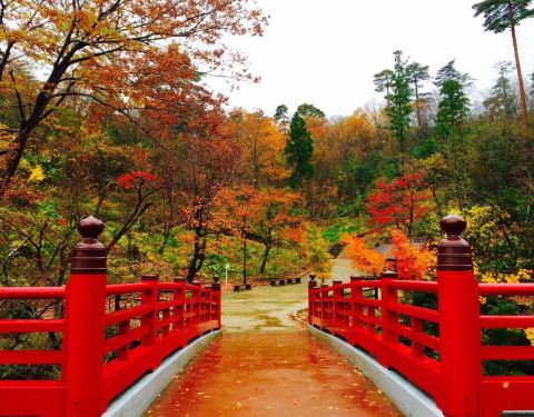 新潟县著名的赏红叶胜地。在深秋,弥彦公园迎来了最美丽鲜艳的季节,在这个总面积达16万平方米的公园内,被称为红叶谷的清溪上架着朱红色的观月桥,赤桥、满地的杜鹃花和菖蒲再加上满天红叶交织,这里的景色绚烂...