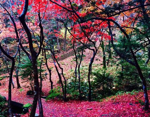 新潟县著名的赏红叶胜地。在深秋,弥彦公园迎来了最美丽鲜艳的季节,在这个总面积达16万平方米的公园内,被称为红叶谷的清溪上架着朱红色的观月桥,赤桥、满地的杜鹃花和菖蒲再加上满天红叶交织,这里的景色绚烂却让人心平气和。 有人说枫叶是代表永恒 有人说枫叶代表堕落 但我想枫叶代表着温情 枫叶是那么的温暖 它给任何看到它的人一丝希望 它让人明白了温暖的含义 刚才和朋友聊天,被嘲笑为花痴。因为我说:对我来说,日本就是春日樱花、冬日梅花和秋天红叶。 接下来的日子,我会满世界追着红叶跑,无论看过多少次,无论去过多少红叶名所,那漫山遍野的红叶,总能让我激动万分。