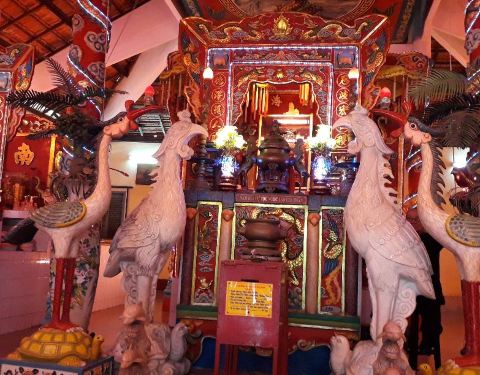 庙宇的风格体现了中国风,屋顶用的是“阴阳”风格的砖瓦,砖瓦的形状犹如“双龙戏月”。庙中的建筑也是按照五行的顺序进行排列的,柱子上的龙雕刻的栩栩如生活灵活现。是为了纪念三位老人在头顿的Thắng建立了三个村落。很不错的地方!