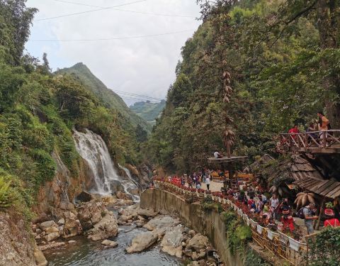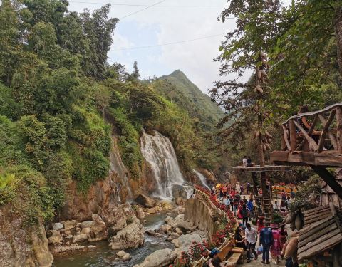 从沙坝步行1.5km可达,沿途可拍高山风光,回来考虑打车或摩托。里面有瀑布,黒苗舞蹈,寨子等,越南女喜欢着少数民族服装也是热点。