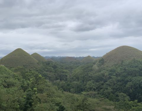 去往巧克力山会路过这段森林,高高的翠绿的树叶在雨滴的滋润下亮亮的闪着光,能闻到泥土的芬芳清新湿润,下过雨路有点湿滑,看着两边的树缓缓的退向两旁那瞬间仿佛去赴一场青春的约,不相聚,不散场。路过~要不是团友提醒,真心错过了~但是因为下雨,所以也就懒得下去拍到此一游。因为在中国南方的乡村也看过挺多差不多一样的景色~