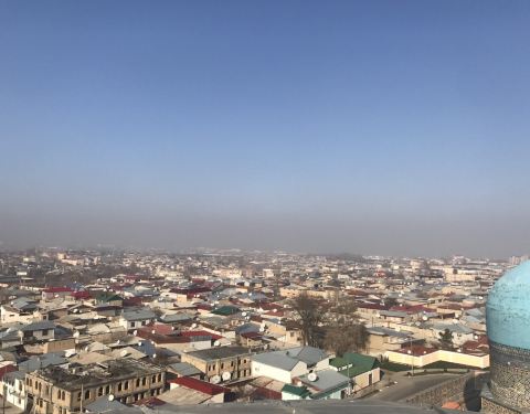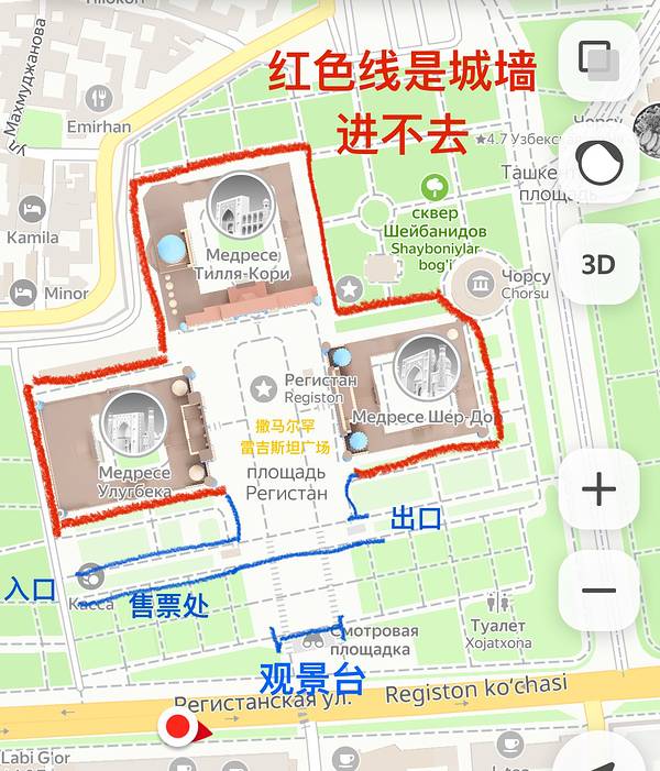 门票三万苏姆。确实很壮观!门口有个专门拍照的地方。可以把全景拍下来。撒马尔罕是古代丝绸之路的重镇。来撒马尔罕必须来雷吉斯坦广场。我后来又花了2万苏姆登塔,只能一个人上去,到了塔顶,只能一个人探出头。上去的时候抓着绳子,爬特瘪高的楼梯,下来的时候腿直抖。疼了两天,不过很值得一爬!