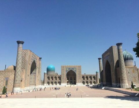撒马尔罕【雷吉斯坦广场】 Registan 雷吉斯坦广场是帖木儿帝国国都撒马尔罕的中心。“雷吉斯坦”一词在波斯语中意指“多沙的地方”或是“沙漠”。雷吉斯坦广场是个城市广场,首都人民会聚集在这里听取皇告,乃至围观罪犯公开处刑。几个世纪以来,雷吉斯坦广场上的建物遭到严重破坏,并在前苏联时期透过修复及重建以恢复到原先状态。 雷吉斯坦广场和三个伊斯兰学校建筑。从左到右:乌鲁伯格经学院、提拉-高利经学院和舒尔-多尔经学院。 门票:6w5索姆(39元) 时间:8:00-20:00