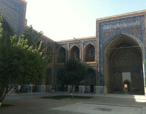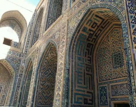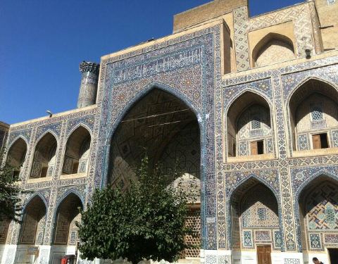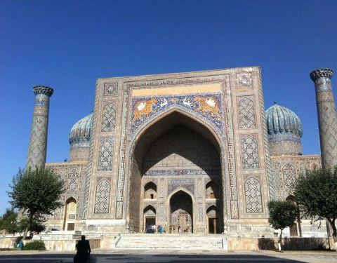 SherDorMadrasah同样属于雷吉斯坦广场三所经学院之一,位于UlugbekMedressa的对面,建成年代则晚了200年左右。值得观赏的一点是,其建筑上看上去像虎的装饰图案,其实是狮。这也是为什么这座经学院又被称为LionMedressa。