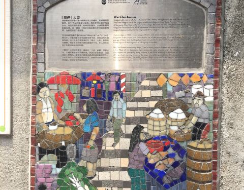 公车来到伯大尼修院看了校园里面美美的小教堂,出来等公车的时候,看到旁边是一处凌乱错落的村屋,像是市区里的贫民窟似的。原来这里也是一个景点,就是薄扶林村,是港岛内仅剩下的三个围村之一。村子里的居民在尽量的让这个破败的家园显得有那么一些文艺范儿,出入口和指路标都多少有一些艺术元素,倒也不容易迷路。村子里有不少的古迹,虽然已经看不出来古迹是什么,但是旁边都有小小的牌子作为宣传,以彩色的马赛克拼出相应的图案,还是很花了一些心思的。
