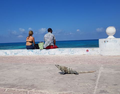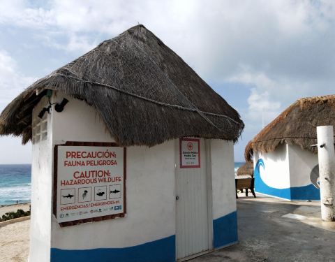 海豚海滩是酒店区唯一的一个公共海滩,因为酒店区里面的酒店基本上都有自己的海滩,所以过来公共海滩的人反而会比酒店里面的海滩更少人。 就位于酒店区的中南部位置,坐r1r2都可以到的,公共海滩区域还是蛮大的,而且这边的景色真的是很好,加勒比海真的很美,蓝的绿的,透明的……海风是对岸的南美的味道。 公共海滩是有洗浴区跟洗手间的,下面也有免费的遮阳伞,但是没有桌椅,可以直接下去游泳的,这里有救生员,当然更多见的就是这边的蜥蜴。