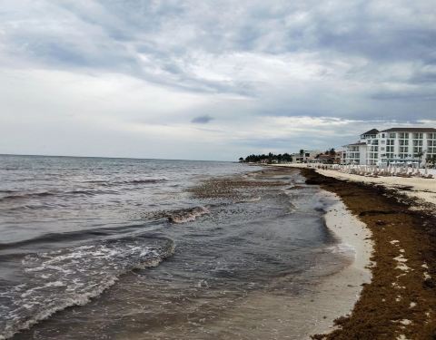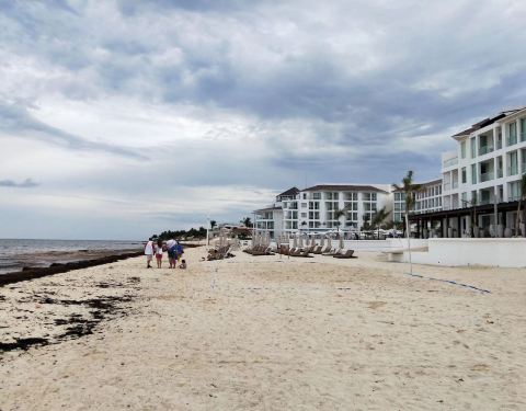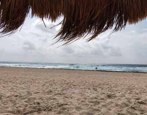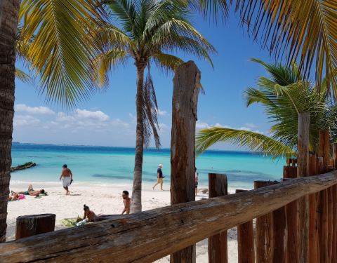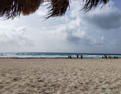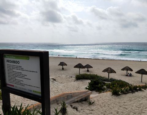 位于坎昆酒店区7字形大道的右侧,其对面是国王遗址。这个海滩是对游客开放的公共海滩,游客非常多,在海滩的外侧还有坎昆的彩色字母地标可以合影拍照
