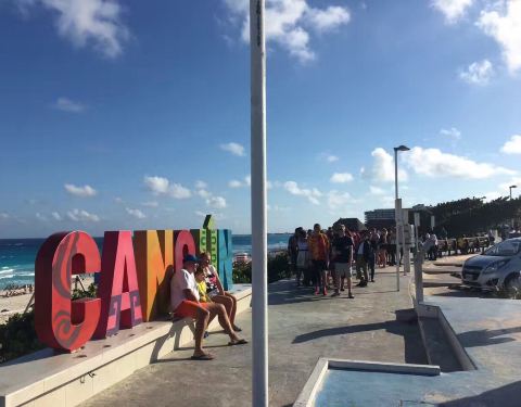 ...,人很多,大家都排队和经典的坎昆牌子合影,整个海滩非常漂亮,很干净,再加上蓝天白云,环境非常好