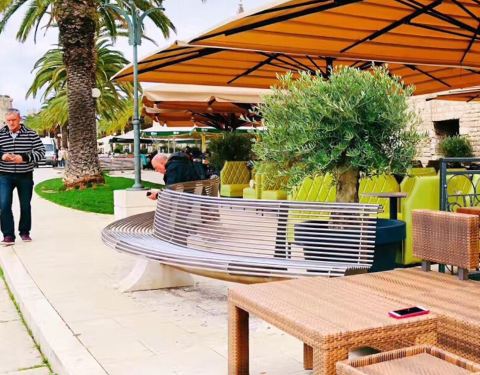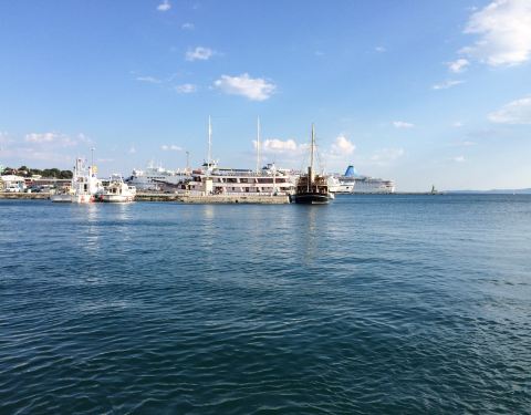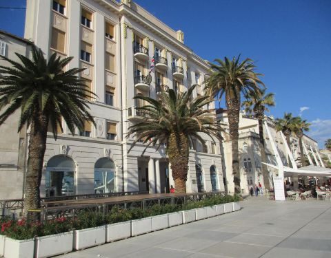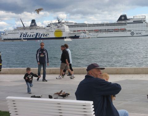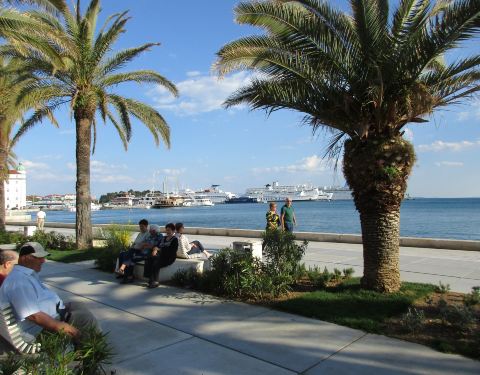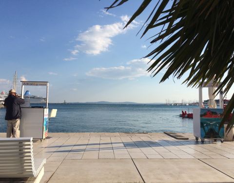 戴克里先宫南侧的海滨大道是一条宽敞的步行街,是斯普利特最繁华的一条大街。大街的一侧有很多餐厅、咖啡馆和各种小店,另一侧就是亚得里亚海了。海边的长椅坐着悠闲看街景和海景的人们,我们也是其中之一啊。第一次看到亚得里亚海,还是挺兴奋的。街景海景都不错哦。