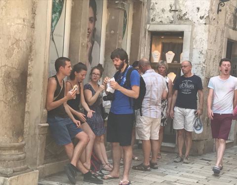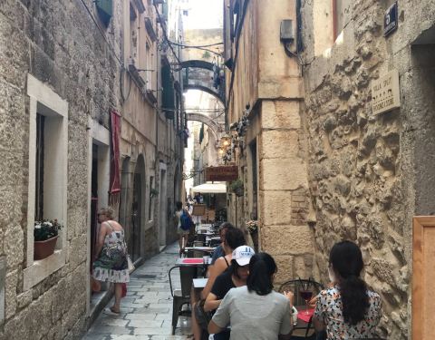 戴克里先宫南侧的海滨大道是一条宽敞的步行街,是斯普利特最繁华的一条大街。大街的一侧有很多餐厅、咖啡馆和各种小店,另一侧就是亚得里亚海了。海边的长椅坐着悠闲看街景和海景的人们,我们也是其中之一啊。第...