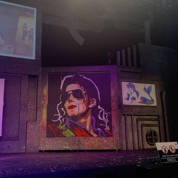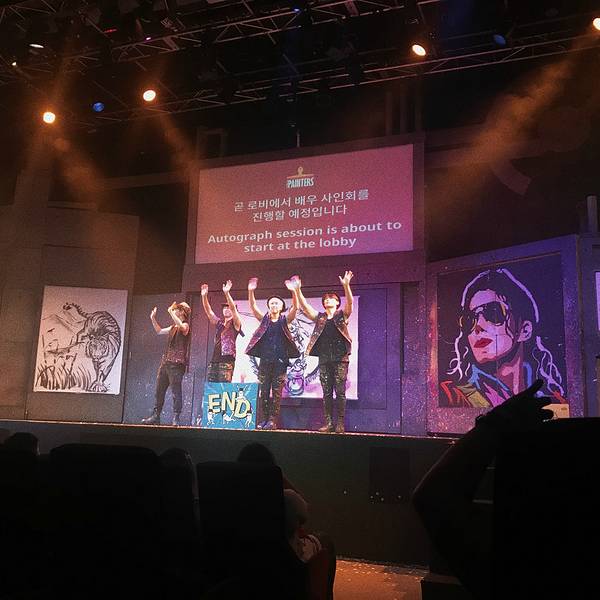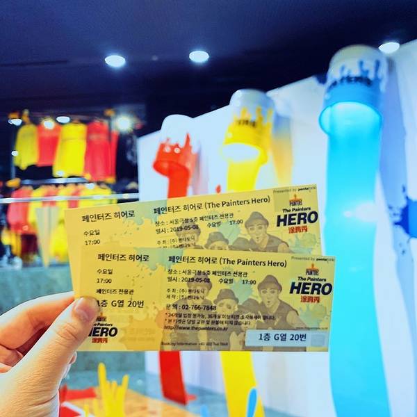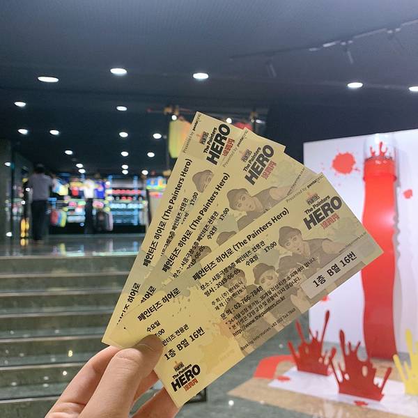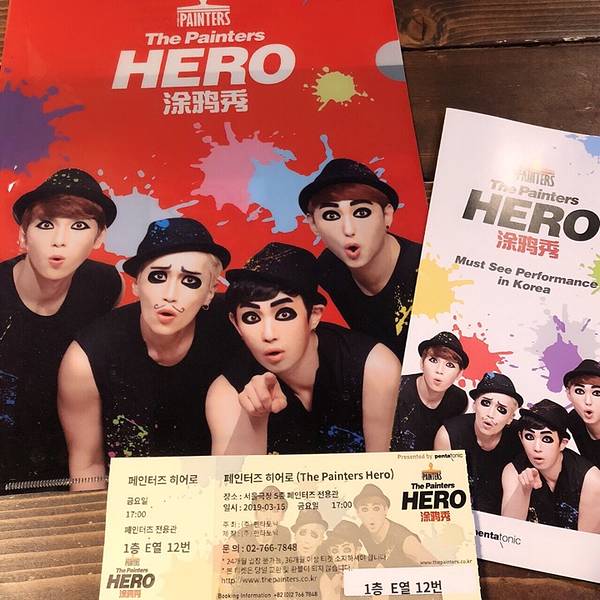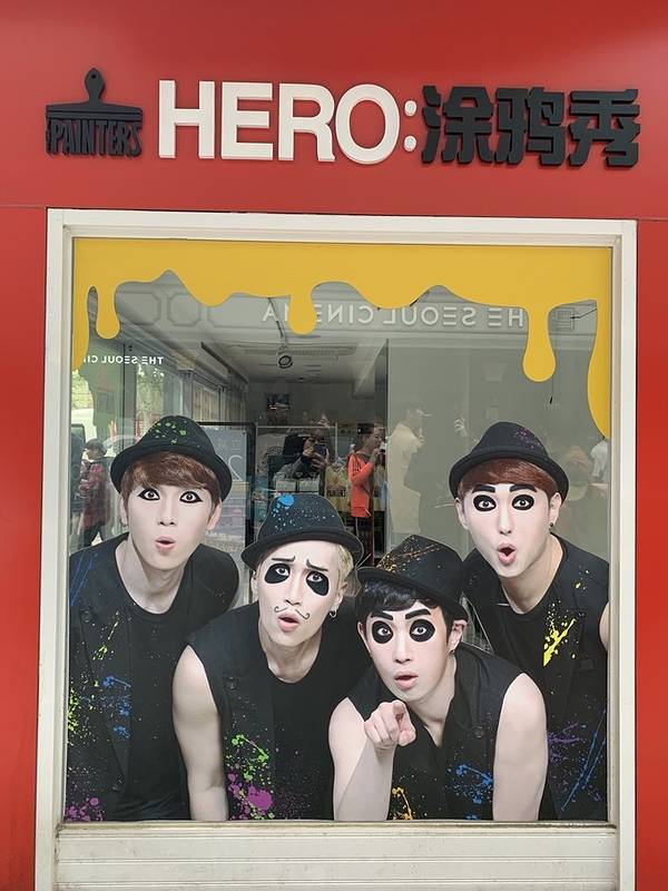 小九曾经在高中就是一位画板搬运工,携带了美术身份三年。难得在异国他乡欣赏一下涂鸦秀内心有些小激动的~嘻嘻我们是在蚂蜂窝订的门票比较优惠,先去现场取票。不过大家也可以现场购票,4~6万韩币。从地铁出来走约3分钟就可以看到-HERO涂鸦秀-巨幅海报!然后下面有个ticket取票处,拿着票就可以进剧场。涂鸦秀是由四个 韩国 小哥哥组成,但是作品的内容多是 韩国 以外:中国的和其他国家题材的, 比如 李小龙、刘关张、美人鱼和迈克尔 杰克逊 等。每个模块系列都特别有趣,四个小哥哥含有有趣担当帅气担当和搞怪担当,全程用自己的表演来换取大家的开心。坐在前排VIP区域还有机会与表演者们互动,得到小型画作和纪念T恤哦~~~小九这次没被点到小失落