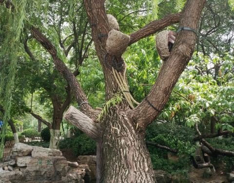 泉水旁边大树要倒塌,用水泥柱子撑起来,显得很危险,水下冒着泡,北岸岩石上镌“虬溪泉”名刻泉水旁边大树要倒塌,用水泥柱子撑起来,显得很危险,水下冒着泡,北岸岩石上镌“虬溪泉”名刻。水自池中隐于自然石下的铁管涌出,沿石溪穿竹林流入护城河。