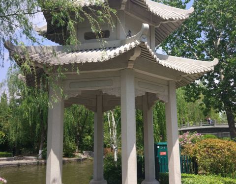 明湖新景区百花桥西有一石亭,名灰山亭,通体雪白,重檐攒尖六角,很是秀气