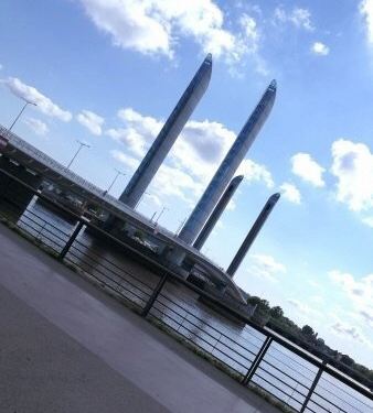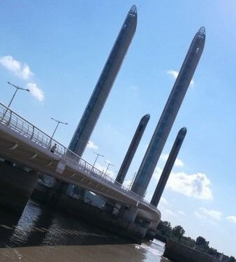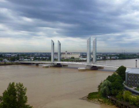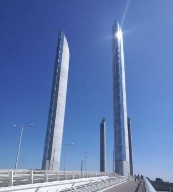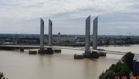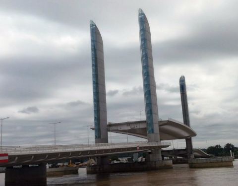 这是波尔多最具特色的一座桥梁,桥中间部分可以垂直上下升降,平时是与道路连接通车的,有重大节日或活动的时候桥面上升到很高,以便邮轮可以通过,非常的高科技。