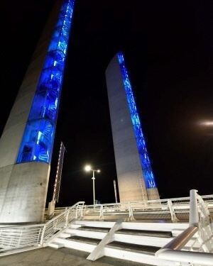 这座桥足够吸引人,但当游轮需要通过时,它会呈现出一个全新的形象。一个星期四,大桥关闭了几个小时。它在引道上的标志上做了广告,在规定的时间内,禁止通行,并被高高举起来。载有1200人的游轮在桥下巡航,然后桥降到正常高度。相当壮观的景象和大量的人和摄像机沿着河边排队观看。