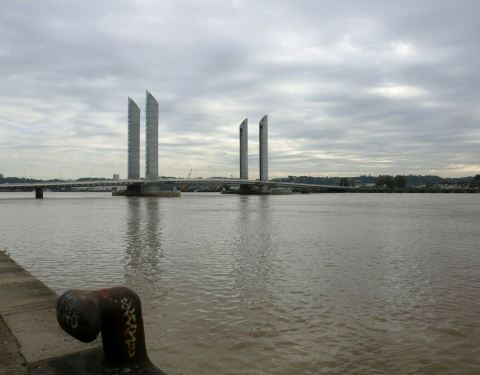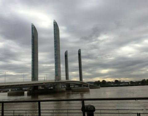 波尔多雅克·沙邦-戴尔马大桥下面的河水是浑浊的,你可以沿着加隆河走到下一座桥-皮埃尔桥。这座桥本身是没有历史的,一座很现代的桥梁,中间可以打开让游船从下面经过,远看就像两个大烟囱。