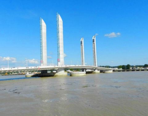 波尔多雅克沙邦戴尔马大桥是河上一座非常著名的桥梁,桥头两端4根直立的立柱就像是4把利剑直插空中...