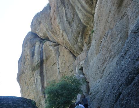 这是在另外一座山岩之顶的修道院,宾馆提供的手绘地图上标注它的高度是570米。虽然仅比前面的圣三位一体修道院高度低5米,但游客要从半山的公路上走下到山谷,然后通过山岩中的一个小门洞进入这座修道院的登山台阶。登山台阶依山崖盘旋而上,一人宽的台阶路很能体会道“一人把关,万夫莫过”的意境。当初这里位于山崖之巅的修道院唯一与外界相通的工具是绳索、藤篮和滑车,因此进入修道院有如登天般地困难,所以有幸到达这里的人为数也极少。直到20世纪,登山石级的修建才改变了这种情况,当然旅游业也就因此发展起来了。一段陡削的台阶(宾馆的手绘地图标注140级台阶)登山后,看到山崖上一个大铁门,修道院下班后就是关闭这个铁门的。再往上来到修道院不大的门口,购买3欧元的门票,穿裤子的女士仍旧要围上修道院提供的花布围裙,然后走进修道院参观游览。 这个山顶的圣斯蒂法努修道院房屋比较低矮,但柱廊顶立的空间内还是显示出一种深奥,一进大门旁的悬崖边有一个小屋子,里面摆放着钢丝绞盘和挂钩,真实地再现了当年没有登山台阶的时候,物质和人员是如何通过绳索绞盘吊到如此高的地方。修道院室内的柱廊角落里摆放着几个巨大的陶器,应该是当年山顶上用来蓄水的工具。走进修道院的圣殿,这个殿堂不大,一群欧美游客正坐在周边信徒们听布道时坐的位置上,听着随团导游有声有色的讲解介绍。对于他们来说,到这里游览,还有更多回味自己的信仰曾经如何经历磨难而重生的涅槃之旅,而我们则主要是看风景。离开圣殿走出修道院的后院,高大的岩石上可以看到远处另外四座修道院矗立在不同山岩之顶的身影,那是我们明天的游览目标。