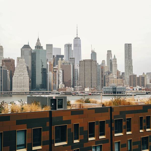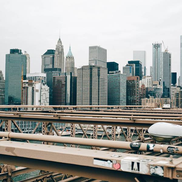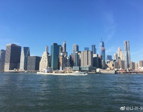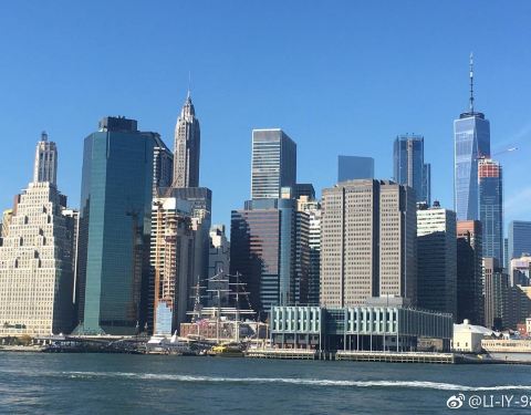 在布鲁克林大桥公园,望着对面曼哈顿岛,高楼耸立,它是纽约曼哈顿最亮点的景区之一,左前方隐约可见自由女神像,右前方是布鲁克林大桥和曼哈顿大桥,布鲁克林大桥横跨纽约东河,连接着布鲁克林区和曼哈顿岛,二...