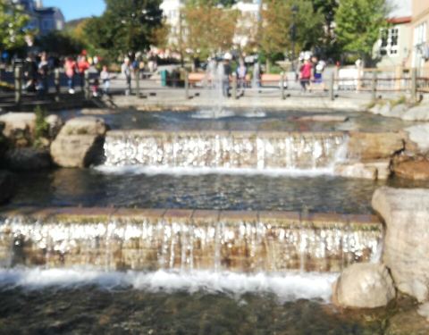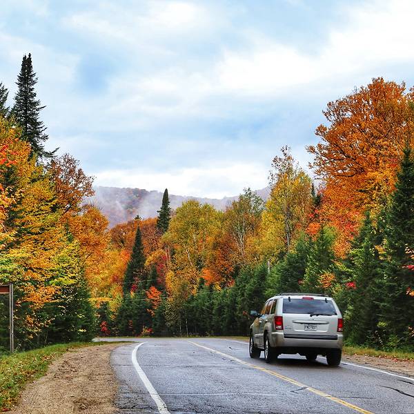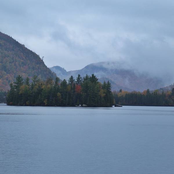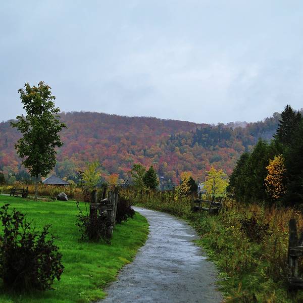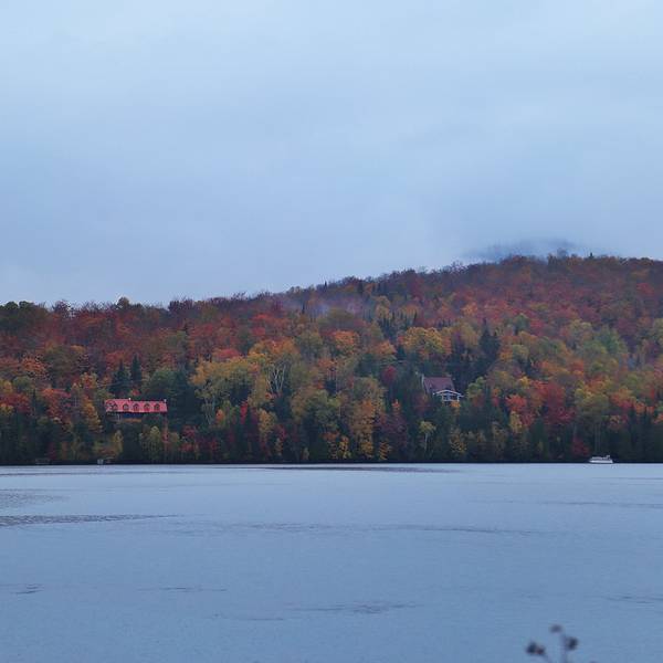 上高速没多久,天就下起雨,路边的枫叶已渐次红了起来。到蒙特利尔时,雨已经如瓢泼般,所有车速依然很快。从蒙特利尔转向北,一团团云雾飘来飘去,已经看不清路两边的风景,隐约觉得进了山区,路边的颜色更丰富了。