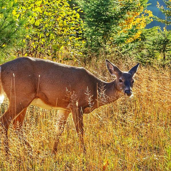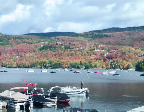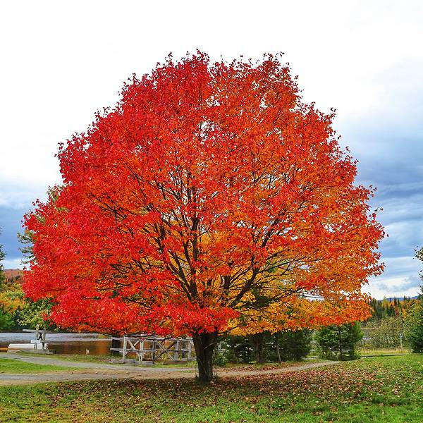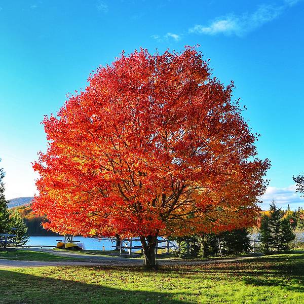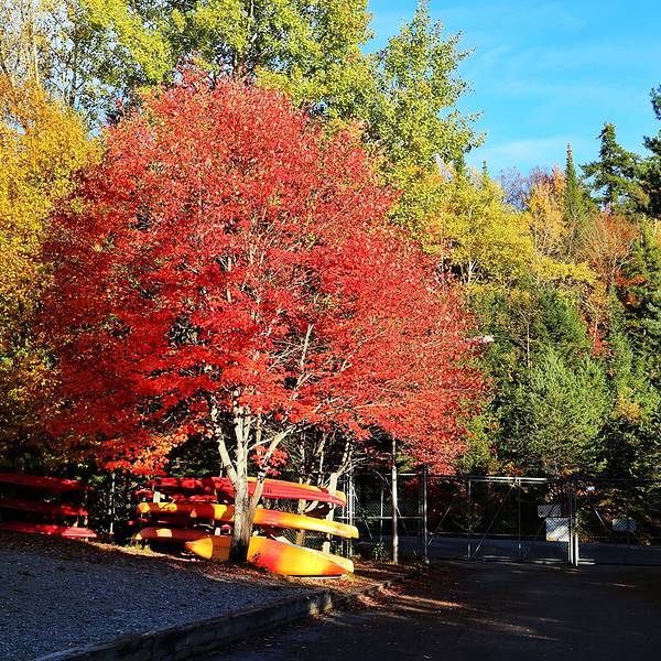 这时天已大晴,阳光暖洋洋的洒进了山谷。继续往回开,随便找了一个露营地停车走走路,竟然有意外的惊喜,湖边有一个冲积的沙堆,可以一直向水中走十几米,反过来顺光拍湖边,湖面安静,倒影美极了。露营地有几棵红透了的枫树。逆光下的枫叶更为鲜红。草丛中的一头鹿看见我们,只是抬头看了看,又继续低头吃起草来,我们可以离得只有一两米看它,不过没敢摸。返回到第一个停车场时,有光线的场景又是一种天地。快落日了,独木舟们也都收了。一棵金黄一棵鲜红刚才最漂亮的树,沐浴了阳光,焕发了又一种光彩。其实这棵树很大很高,我站在树下,头才刚到最下面的叶子。几只加拿大鹅,一晃一晃的从我们眼前走过。太阳很快落山了,我们依依不舍的开始返程,感觉整个公园还有好多好多路径可以值得深入的去转转,只是时间不允许了。