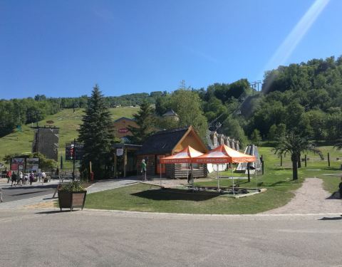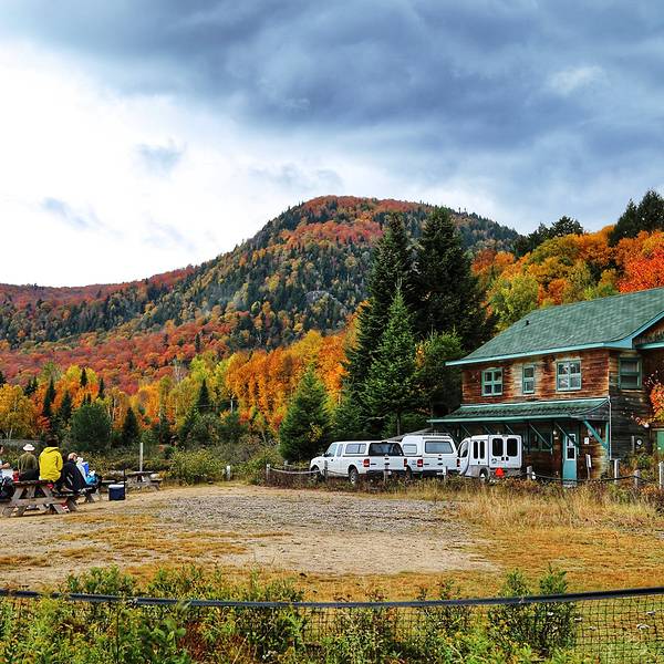 沿着湖边小路可以走到湖边。但是有些区域表明是私人领地,不要进去,我们就在一个湖边的荒草地看了看湖对岸的彩色山林,雨后云雾升腾,别有味道。从湖边的度假村再前行10公里就到达蒙特朗布朗公园,直接在路中间的检查站买门票,一个人8加币。